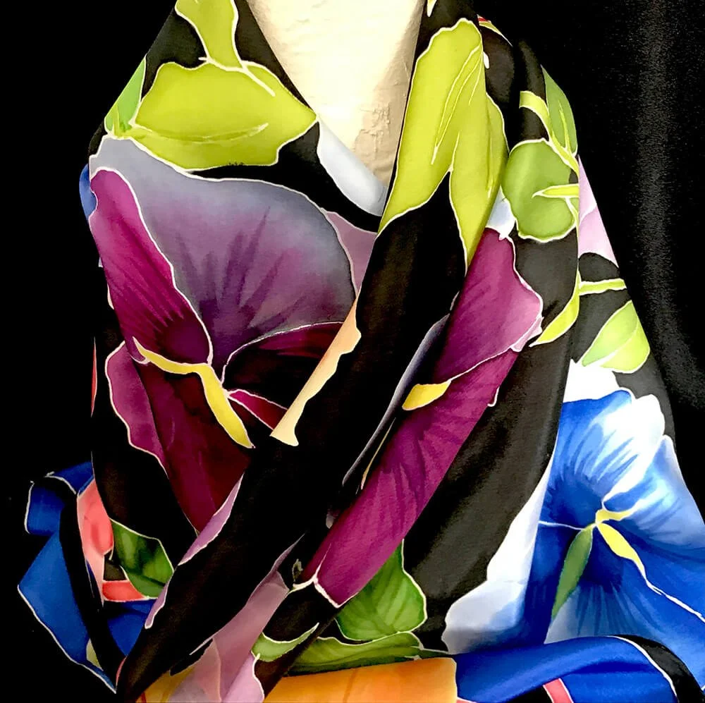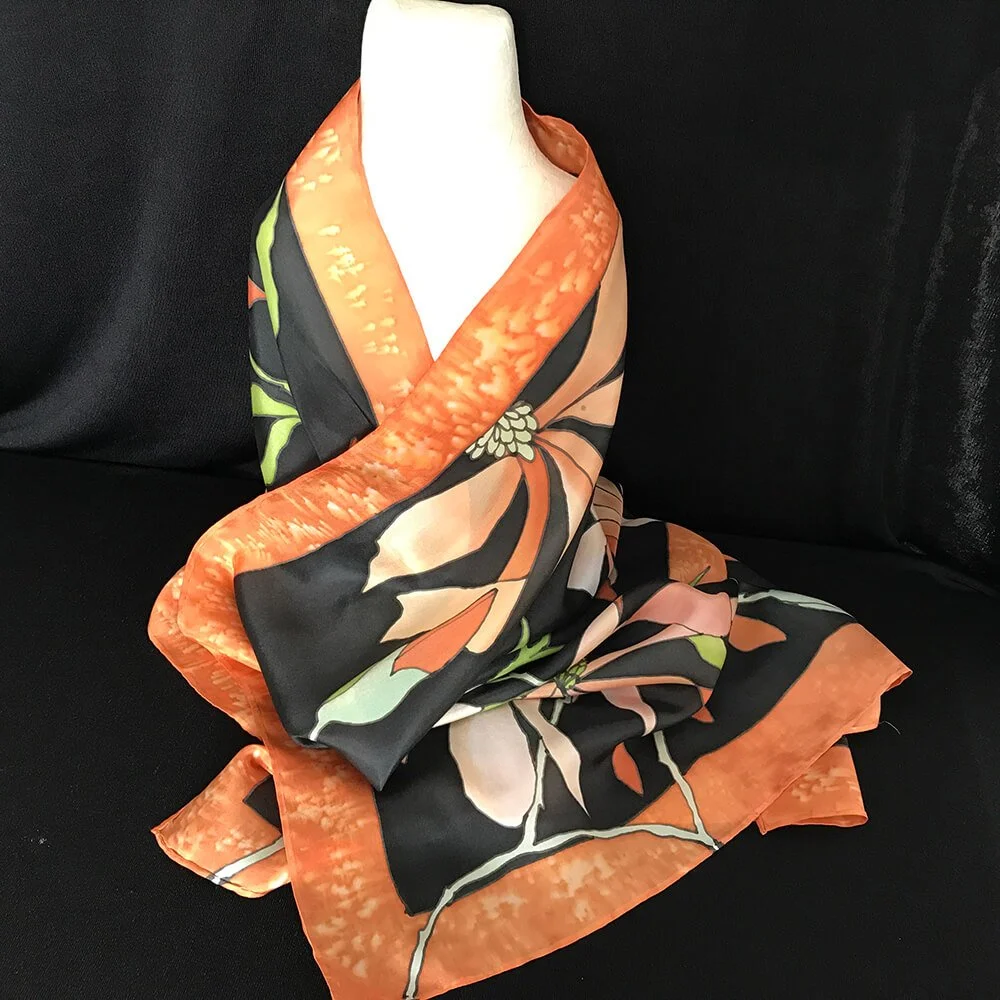 As far as I can remember I have been painting in one medium or another since my childhood. My main inspiration comes from flowers but lately I have been trying to paint abstract or figures. However, my main passion is painting on silk fabric scarves with French dyes which results in bright and permanent colours. All designs are my own creations which are based on real objects or my imagination. These are original designs.